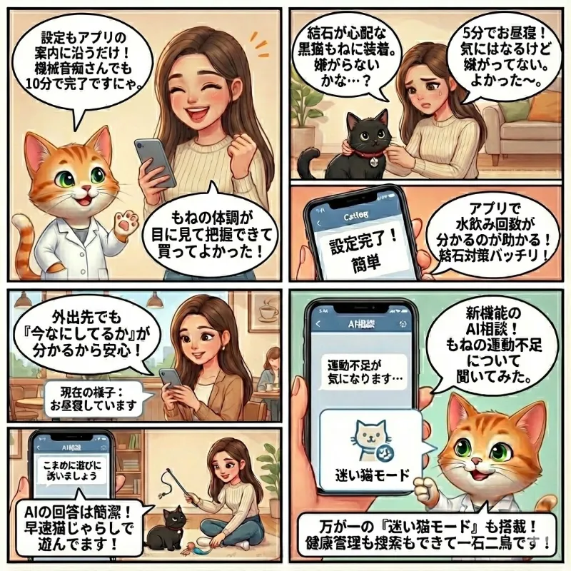 また、専用アプリから猫の行動や体調をリアルタイムで確認できるため、飼い主が外出先でも安心感を得られます。