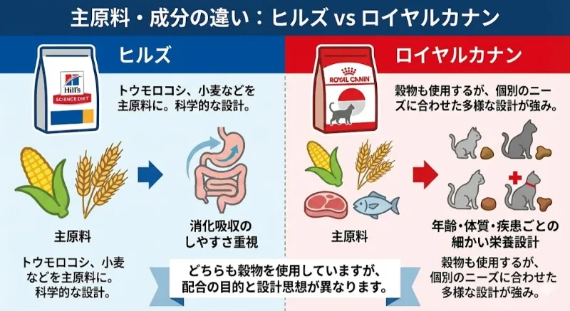 ヒルズもロイヤルカナンも穀物を使用していますが、配合の考え方や目的には違いがあります。